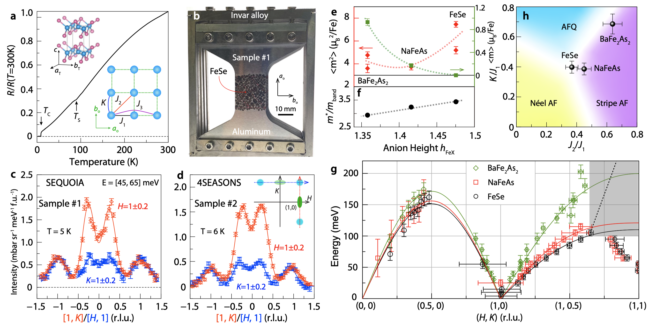 图 1. 样品表征、退孪晶装置与主要结果总结。a FeSe单晶的电阻率随温度的变化曲线。b 单轴应变装置示意图:该装置基于因瓦合金(Fe₀.₆₄Ni₀.₃₆)框架与铝片之间热膨胀系数的差异而设计。c, d 使用入射能量分别为147.5 meV(SEQUOIA谱仪)和80 meV(4SEASONS谱仪)在[1, K]和[H, 1]方向上测得的能量为E = 55 ± 10 meV的自旋激发一维等能量扫描。e, f FeSe中随阴离子高度 hFeX 变化的静态磁矩(绿色方块)和涨落磁矩(红色菱形),以及3dxy轨道上的电子关联强度(以 m*/mband 表征,图f)。g BaFe₂As₂、NaFeAs和FeSe的自旋激发色散关系。其中动量区间(0, 0)–(0.5, 0)的数据采用RIXS测得。绿色、红色和黑色实线分别表示使用J₁-K-J₂模型拟合得到的色散曲线。灰色阴影区域标出的是自旋激发被强烈阻尼的(Q, E)区间,黑色虚线示意了激发色散在高能处向上弯曲并偏离拟合的趋势。h 从BaFe₂As₂、NaFeAs和FeSe的自旋激发色散拟合中获得的K/J₁和J₂/J₁的比值。BaFe₂As₂、NaFeAs和FeSe的非弹性中子散射数据分别在T = 7 K、5 K 和 5 K条件下采集。