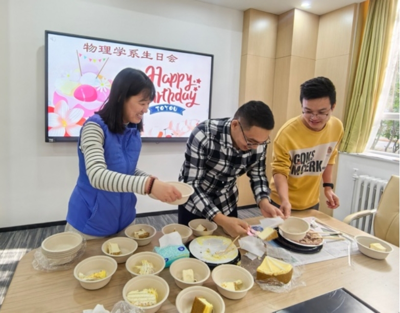 生日在6月到12月的19位老师陆续到场之后,生日会准时开始,大家开心的在背景墙前合影留念。物理学系为寿星们准备了专属的生日午餐和精美的生日蛋糕。在欢快的氛围中,大家共同品尝美食,畅谈趣事,分享生日的喜悦。一句暖暖的问候,一角甜甜的蛋糕,一份浓浓的关怀,都让老师们为这个集体而感动。