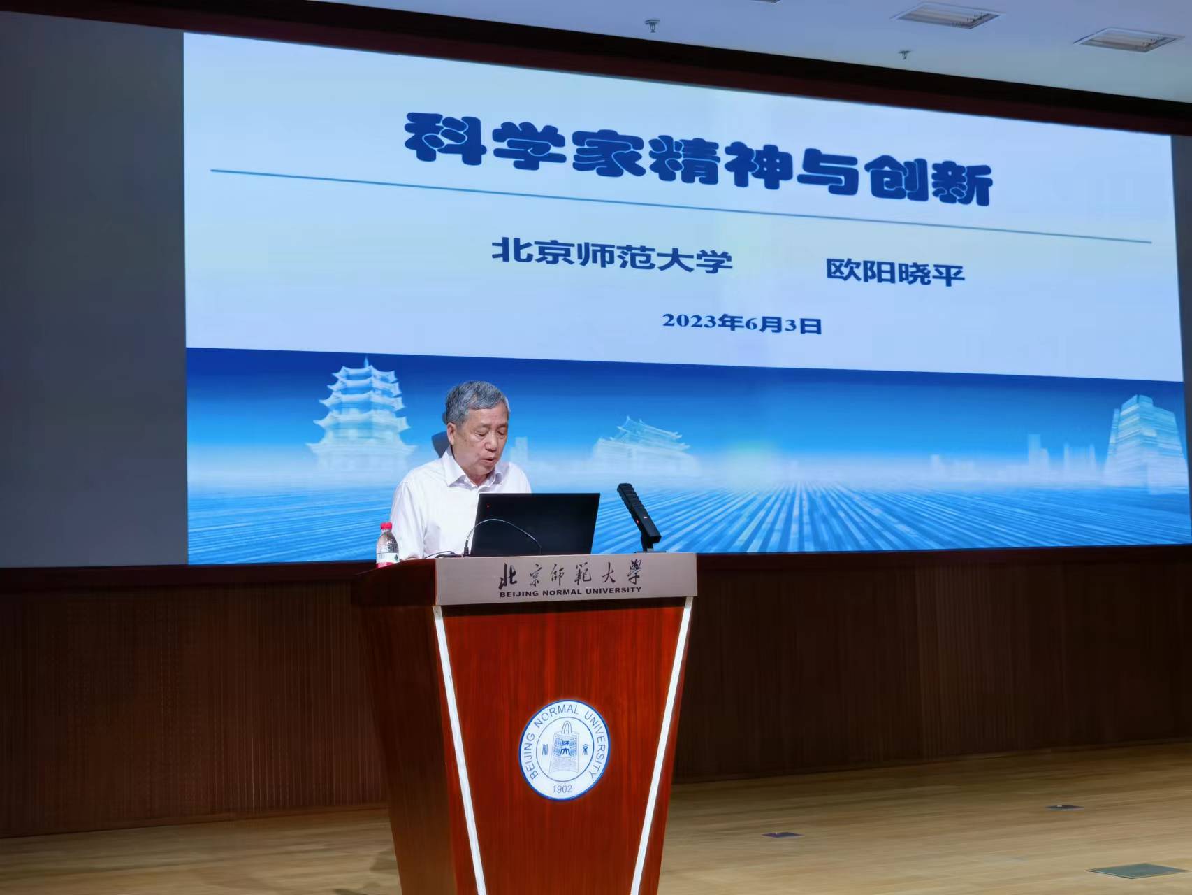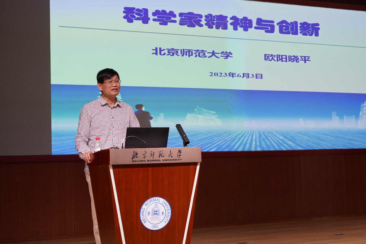 为庆祝第七个全国科技工作者日,大力弘扬科学家精神,2023年6月3日,物理学系主办、《大学物理》期刊协办了以“点亮精神火炬 放飞科学梦想”为主题的全国科技工作者日专场京师物理科普大讲坛暨小小科学家培育基地首场活动,特别邀请中国工程院院士欧阳晓平做题为“科学家精神和创新”的主旨报告,加强对青少年的思想政治引领,让青年学生近距离感受科学家的学术素养和家国情怀,锤炼创新精神的同时坚定科学信仰,以科普教育助力新时代人才强国战略。