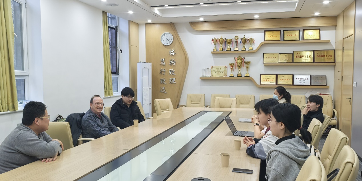 在报告开始前,几名本科生和研究生与Granick教授在105会议室开展了面对面交流。Granick教授与同学们深入探讨了相关学科的发展现状和前景,并提供了宝贵的未来发展建议,鼓励大家开拓视野、保持好奇心,在学习与生活之间找到平衡。
