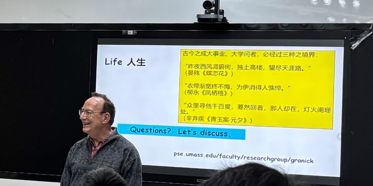 报告以Granick教授的人生哲学作为结尾,深刻而富有启发性。不仅为同学们提供了广阔的学术视角,也为在场的师生们提供了宝贵的意见和建议,激励他们在科研道路上不断探索和前进!
