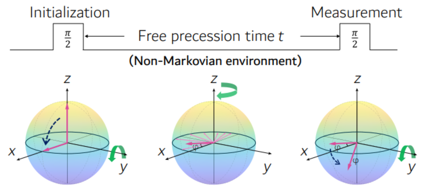 为了解决这两个难题,我们采用我们课题组最新开发的量子模拟方法[5-7]来调制噪声模型,并应用bath-engineering技术来模拟高精度的非马尔可夫环境。上图中展示了bath-engineering的基本模型。类似于经典的拉姆齐干涉,首先将初始态制备到叠加态,然后让其在经过时间调制的哈密顿量