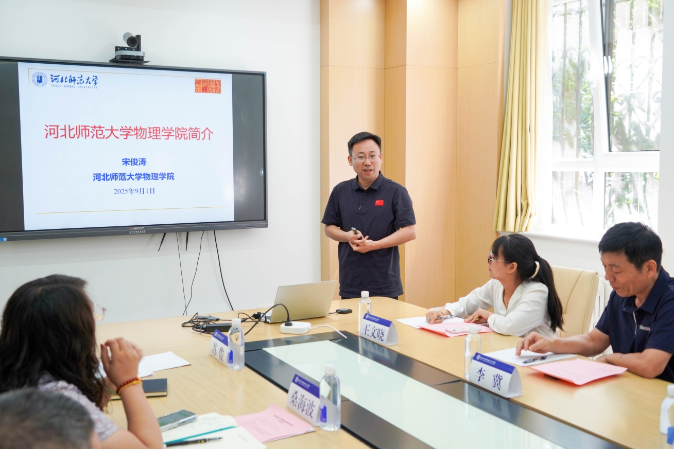 河北师范大学海角视频 院长宋俊涛对此行表示感谢,并介绍了该院的发展历程、学科建设与人才培养成效。他谈到,学院承继自顺天府中学堂与北洋女师范学堂的百年文脉,始终坚持“物理筑基、育人为本”,构建了从本科到博士完整的人才培养体系,物理学学科在第四、五轮评估中持续位居河北省首位。近年来,学院持续加强师资引育和平台建设,着力培养兼具科研创新能力与基础教育素养的复合型人才,为国家和京津冀区域输送了大批科研骨干与教学名师。面对新发展阶段,学院将进一步聚焦物理学科内涵建设,深化与顶尖院校合作,提升天文学科发展能级,强化师范人才培养特色,积极融入国家战略,为实现高水平学科突破与教育高质量发展不懈努力。