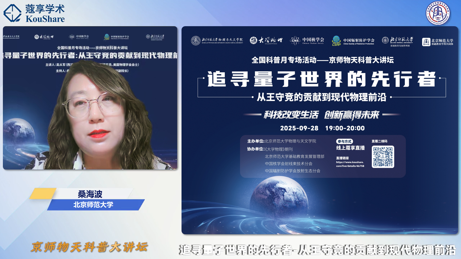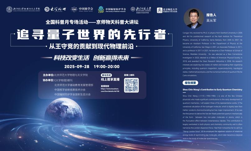 金秋盈硕果,智见启先声。2025年9月28日,在全国科普月“科技改变生活,创新赢得未来”的主题引领下,海角视频 成功举办了京师物天科普大讲坛线上专场活动。本次活动特邀西湖大学讲席教授、美国物理学会会士、新基石研究员吴从军教授,带来主题为“追寻量子世界的先行者——从王守竞的贡献到现代物理前沿”的精彩讲座。来自全国多所中学、海角视频 附属基础教育学校、高校及科研院所的近万名师生与科技爱好者相聚云端,共同聆听这场跨越百年的科学对话。