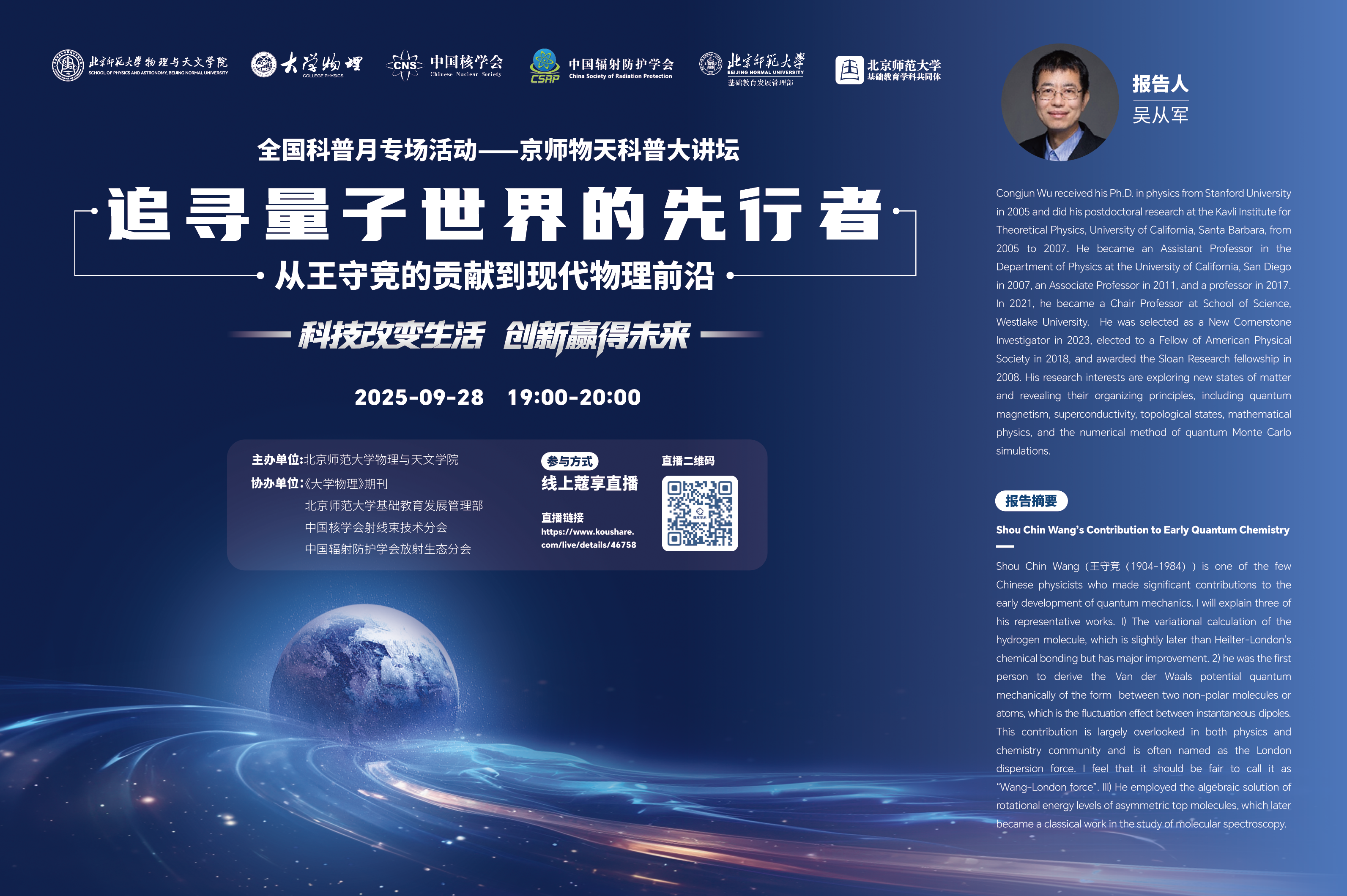 2025年9月28日,在全国科普月“科技改变生活,创新赢得未来”的主题引领下,海角视频 成功举办了京师物天科普大讲坛线上专场活动。本次活动特邀西湖大学讲席教授、美国物理学会会士、新基石研究员吴从军教授,带来主题为“追寻量子世界的先行者——从王守竞的贡献到现代物理前沿”的精彩讲座。来自全国多所中学、海角视频 附属基础教育学校、高校及科研院所的近万名师生与科技爱好者相聚云端,共同聆听这场跨越百年的科学对话。