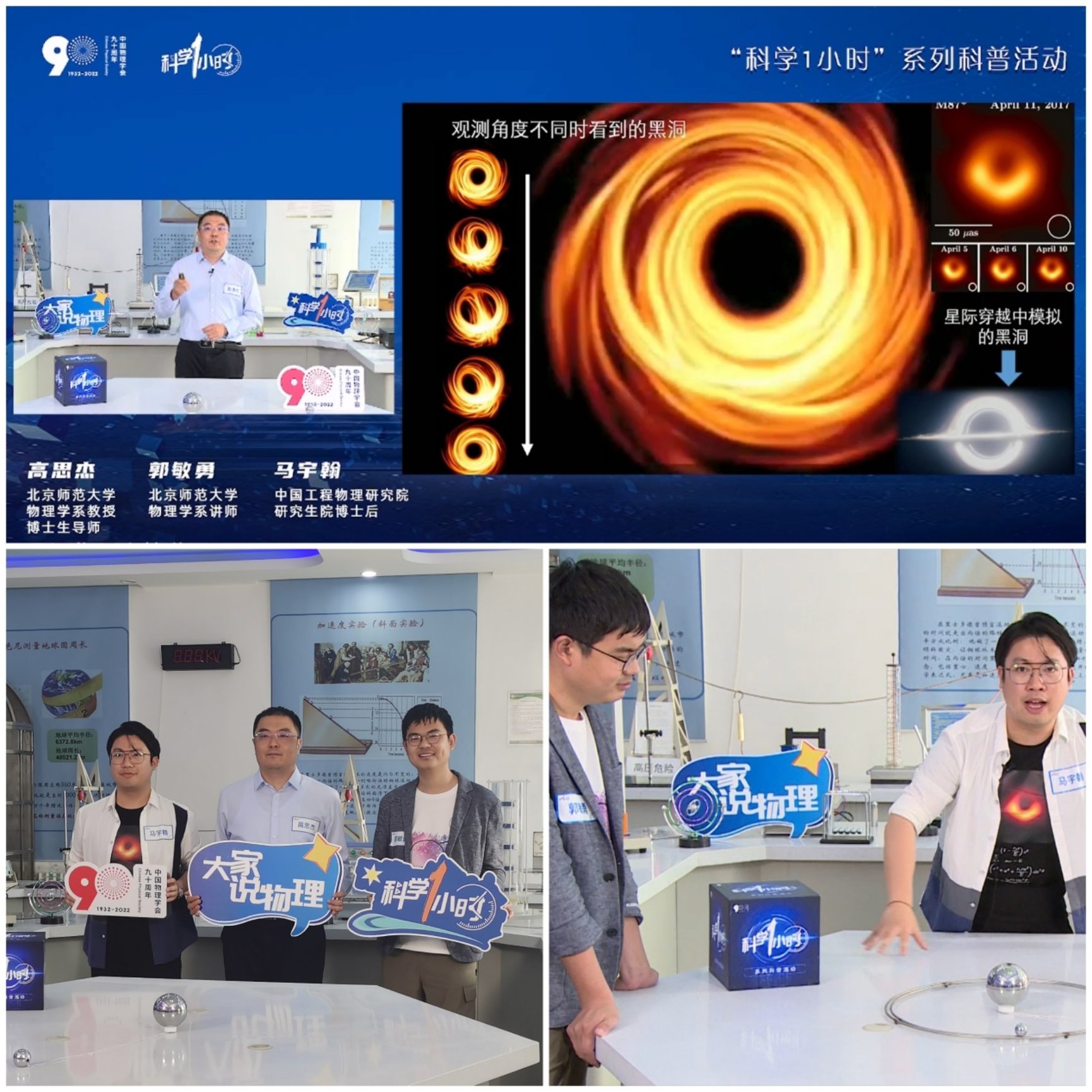 此次直播活动依托中国物理学会《科学一小时》之大家说物理系列科普活动,由物理学系教授高思杰、青年教师郭敏勇及我系优秀毕业生现中国工程物理研究院博士后马宇翰共同展开题为“黑洞物理奇妙游”的科普课程。黑洞物理相关的引力与相对论研究是物理学系优势特色学科方向,具有长期的师资传承和教研积累,包括梁灿彬教授和赵峥教授在内的多位名师也一直从事相关科学前沿的科普工作,在国内外有着重要影响力。“黑洞物理奇妙游”直播课程用通俗易懂的语言、生动有趣的例子和简单易行的类比实验,讲述